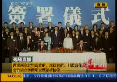 中新網(wǎng)臺北11月4日電 據(jù)本網(wǎng)記者從現(xiàn)場發(fā)回的消息:大陸海協(xié)會會長陳云林與臺灣海基會董事長江丙坤今天下午14時許在臺北就兩岸海運、空運、郵政、食品安全等議題簽署四項協(xié)議。