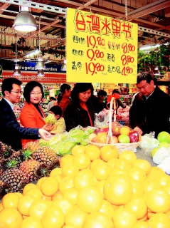 中新網3月24日電 據(jù)臺灣《聯(lián)合報》報道,兩岸實現(xiàn)“大三通”后航運時間大幅縮短,運輸成本也降低,讓臺灣水果在大陸重啟生機。上海百聯(lián)集團旗下世紀聯(lián)華超市近日推出“臺灣水果節(jié)”活動,大力促銷臺灣水果,不但水果出貨時間比過去縮短一半以上,水果新鮮度得以保持,售價也比過去便宜30%,讓臺灣水果更具競爭力。