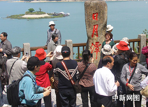 今天的日月潭碧水藍(lán)天,波光粼粼,浙江游客泛舟湖上,在湖中小島日月潭碑刻前,游客為拍照留影在烈日下苦等也樂此不疲,一位朱姓游客坦言,家鄉(xiāng)的西子湖和日月潭各有千秋,“日月潭自然美,西子湖人文美,各有各的味道。”