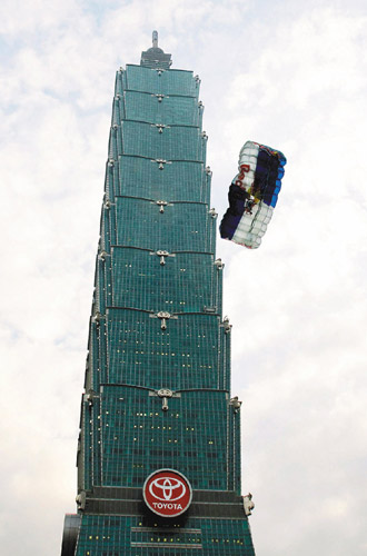 據臺灣《中華日報》報道,38歲的奧地利定點跳傘者Felix Baumgartner(中文譯為彭剛納爾)于11日在未經一O一大樓許可情況下,從508米高的臺北一O一高樓的一露天觀景臺縱身跳傘。