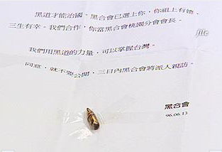 據臺灣東森新聞報道,今年6月從桃園寄到“立法院”指名要給“立委”林淑芬等13名“立委”的恐嚇信,里面還有附2顆子彈,這個自稱“黑合會”的恐嚇者就是前云林縣調處調查員楊清海,早在7年前他就曾經因為控告前“調查局長”王光宇而聲名大噪。