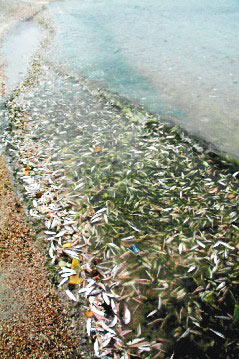 澎湖馬公市青灣海岸漂來(lái)大批魚(yú)尸,珊瑚礁魚(yú)類(lèi)受創(chuàng)尤其嚴(yán)重。 聯(lián)合報(bào)圖