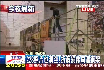 臺“二•二八”基金會昨天晚間運進銅像大廳的“道具”,還包括長近20米,寬1.5米、共兩幅的大型布幅,上面有大手掌圖樣,掌心則有蔣介石的頭像及“Bye-bye”字樣,掛在蔣銅像前,形成強烈反差。