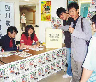 新竹市玄奘大學學生發動愛心捐款,幫助四川地震災區民眾,師生熱烈回應。 聯合報圖