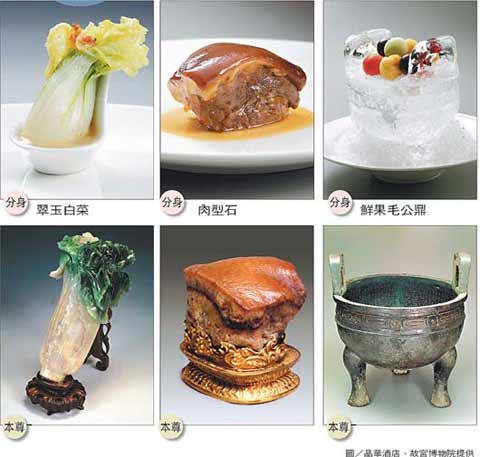 據臺灣聯合報報道,菜色內容與“故宮”文物緊密結合的“國寶菜”,試做菜色就約花了兩個多月。主廚蕭廣安表示,每道“國寶菜”都有相當難度。為了讓菜與文物達到“近乎相同”的境界,“型與味”皆一再調整,直到昨天才完全拍板定案。