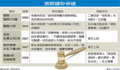 襲胸女子十秒、舌吻女孩五秒,依強(qiáng)制猥褻罪起訴,一審卻被判無(wú)罪,婦團(tuán)痛批問(wèn)題出在法官仍沿用1928年法院判例對(duì)猥褻的定義,只從加害人而非被害人角度考慮,才會(huì)認(rèn)為“發(fā)生時(shí)間甚短、不算強(qiáng)制猥褻”,“法官跟不上時(shí)代!”