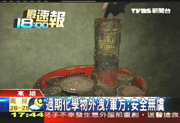 化學品上頭寫著DS2-消除劑,生產日期是1989年3月,有效期限只能到1992年3月,全是臺軍聯勤204廠所制造。制造方表示說:這些被棄過期化學品“對人體沒有影響,消除劑里頭有強堿,對環境會有疑慮,我們會專人回收處理。”