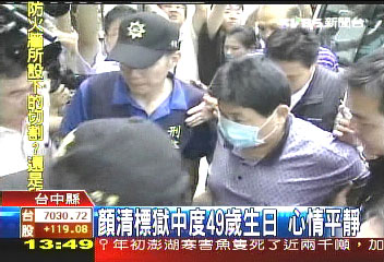 中新網8月25日電 臺灣“立委”顏清標入獄第5天,今天剛好是他的49歲生日。有“立委”朋友前往探望,為他慶祝生日。