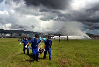 航空器事故救難演練,救難人員搶救模擬失事客機乘客。 “中央社”圖