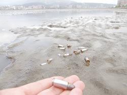 據臺灣《中國時報》報道,一名陳姓釣客12日中午趁淡水河退潮,前往事發的沙洲帶釣魚,發現距離河岸十米的沙洲泥土中出現大量銀色小圓點,在陽光折射下更顯刺眼,原以為是釣魚用的鉛球,靠近一看才確認是未擊發的子彈。