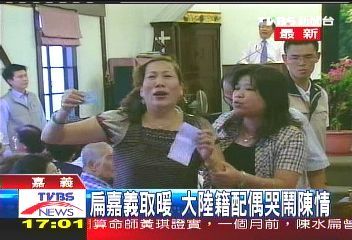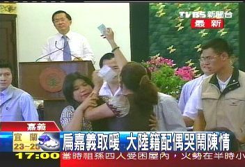 據(jù)臺灣TVBS報道,陳水扁到嘉義“長老教會”,場內(nèi)話才講一半,一名大陸配偶沖上臺哭訴;陳水扁用手擦去眉頭上的汗,場面十分尷尬。