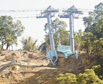 臺北市貓空纜車T16號塔柱基樁裸露,所幸2日上午發生地震時,塔柱沒有受到影響。圖片來源:臺灣《聯合報》