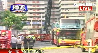 臺北市信義區(qū)松高路工地一架起重機從37樓高墜落砸中游覽車尾部,車上坐著25名廣東旅游團團員,當時他們用完午餐打算前往101大樓參觀,沒有想到意外從天而降,游覽車車體變形。