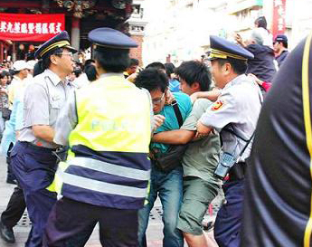 親綠的臺灣《自由時報》4日報道,馬英九昨天(3日)南下臺南為祀典武廟揭牌,有5名反對承認大陸學歷及開放陸生赴臺的大學生到場舉牌抗議,遭穿著武廟工作人員背心的男子推擠,一人被推倒,頭部撞擊地面,抗議學生隨后被警方帶回警局訊問。