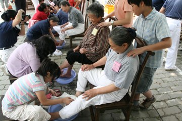 “看到媽媽的腳歷盡風(fēng)霜長(zhǎng)了繭,因日曬留下雙色的印記,內(nèi)心真是百感交集,頓時(shí)體悟到必須更貼心、用心地孝敬媽媽!币幻招〗阍跒閶寢屧∽愫蟮莱鲂闹械母袆(dòng)。現(xiàn)場(chǎng)不少媽媽及子女在浴足的過程都滿懷感動(dòng),有人眼眶泛紅遲遲難以言語,有人不禁流下激動(dòng)的淚水,讓旁人也強(qiáng)烈感受濃濃的孝親之情。
