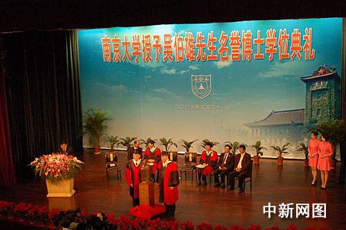 南京大學學位評定委員會副主任吳陪亨宣讀了南京大學授予吳伯雄法學名譽博士學位的決定。決定稱:吳伯雄對于中華文化有著深厚的感情,長期致力于推動兩岸的和平與合作,為兩岸的和平穩定作出了貢獻,他致力于積極推動兩岸的社會進步和文化發展,形成了獨特的政治理念,是海內外享有盛譽的政治家。