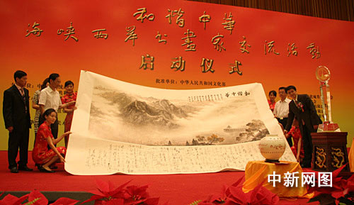 啟動儀式上展出了15幅丈八巨幅書畫作品,全部是著名書畫家的新近之作。由兩岸眾多書畫家聯袂創作的丈二國畫《和諧頌》,集中展示了當代書畫界的最高藝術成就。此幅畫作將作為特殊禮品贈送給海峽交流基金會。
