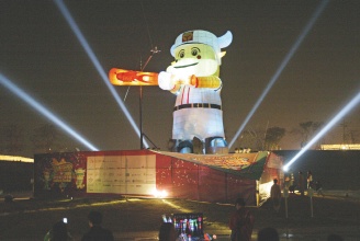 主燈揮棒是今年燈會的主秀,設計單位在現(xiàn)場中央位置以一根細細纜線懸吊著一顆棒球,主燈秀時,棒球從場中“投”向主燈,擔任打擊手的“鈴鈴”將揮出強棒,主燈四周同時施放煙火及雷射光雕。主燈秀將在三日晚間七時上演,預計演出七分鐘。