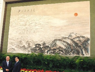 中新網5月29日電 中共中央總書記胡錦濤28日在北京人民大會堂會見中國國民黨主席吳伯雄一行。臺灣媒體注意到,雙方在“江山如此多嬌”巨幅畫前合影留念,蘊含深意。