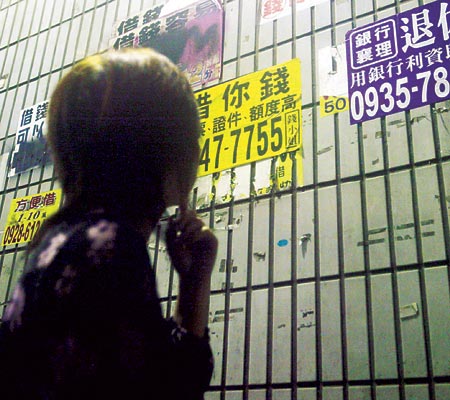 中新網(wǎng)11月1日電 據(jù)臺(tái)灣《中國時(shí)報(bào)》報(bào)道,臺(tái)當(dāng)局“行政院”十月三十一日通過“融資公司法”草案,被外界視為“地下錢莊”將可順勢合法化,草案內(nèi)容規(guī)定自然人年利率上限為百分之二十,法人的上限為百分之三十。圖為市面街道的借貸放款小廣告。