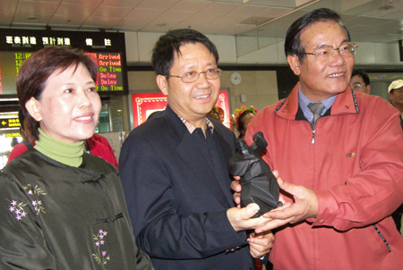 泉州天后宮澎湖參訪團成員林林(中)二十八日抵澎湖馬公機場,是“小三通”第一千名訪澎的大陸旅客。圖為澎湖縣長王干發(fā)(右)致贈紀(jì)念品,左為澎湖縣議會議長劉陳昭玲。“中央社”圖 高茂雄 攝