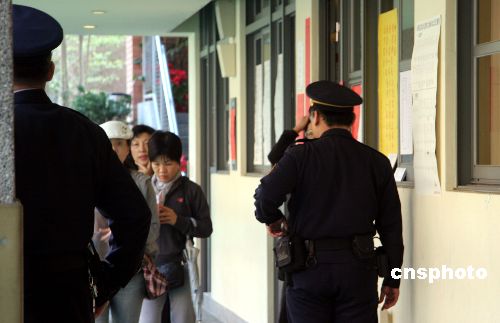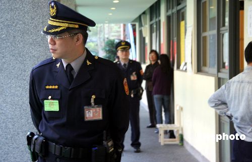 一月十二日是臺灣第七屆“立委”選舉日,在臺北一處投票所,警員現場維安。