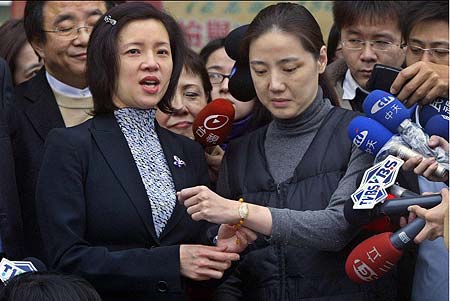 前臺(tái)灣《獨(dú)家報(bào)導(dǎo)》發(fā)行人沈嶸(右)因雜志附贈(zèng)璩美鳳性愛光盤一案遭判刑二年,經(jīng)服刑三百六十四天后于二十六日假釋出獄。光盤主角璩美鳳盡釋前嫌,親自前往桃園監(jiān)獄迎接沈嶸。圖為沈嶸與璩美鳳緊握雙手,在媒體的包圍下離開監(jiān)獄。圖:臺(tái)灣《中國時(shí)報(bào)》