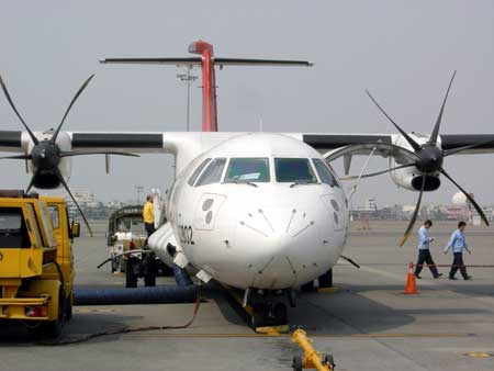 油價(jià)居高不下加上高鐵沖擊,令臺(tái)灣航空業(yè)者的“寒冬”雪上加霜,部分航空公司改以雙螺旋槳飛機(jī)飛航島內(nèi)航線。“中央社”圖 程啟峰 攝