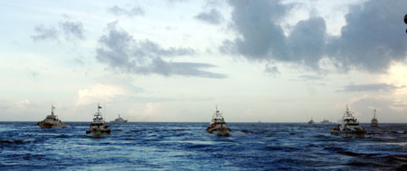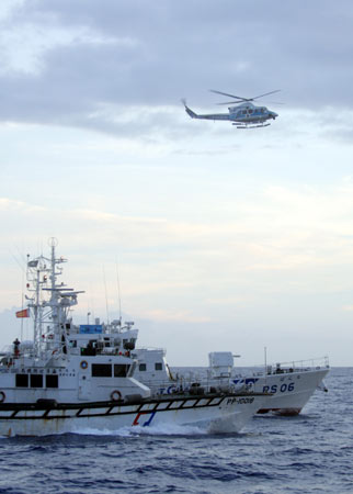 臺灣保釣人士以海釣船前往釣魚島宣示“主權”,十六日清晨當保釣船只接近釣魚島海域時,臺灣巡防艇(前)與日本保安廳巡邏艇(后)相互對峙,不讓日本船只接近保釣船,空中還有日本直升機沿途監視。整個釣魚島海域布滿雙方海防艦艇,情形緊張中相互又頗節制!爸醒肷纭眻D
