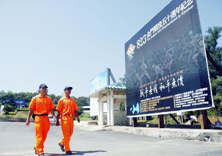 金門八二三炮戰(zhàn)五十周年即將到來,臺灣軍方和金門縣政府合辦系列紀念活動,并在“小三通”水頭港區(qū)布置巨幅看板,提醒“戰(zhàn)爭無情、和平無價”。圖:“中央社”