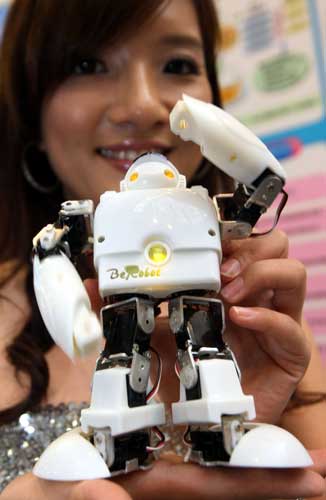 臺北國際機器人展八月二十一日在臺北世貿展覽館開幕,其中,榮獲吉尼斯世界紀錄全世界最小的教育娛樂機器人,由臺灣自行開發,可程序編輯創造更多使用價值。(“中央社”圖)