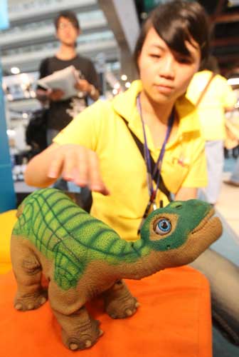 臺北國際機器人展八月二十一日在世貿展覽館開幕,展出的恐龍電子寵物Pleo是全球唯一具有生命型態,會打呵欠、 嘆氣、打呼、打噴嚏,有400種以上動作的貼心寵物。(“中央社”圖)