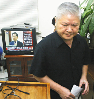 陳水扁昨天下午舉行記者會(huì)的同時(shí),特偵組主任陳云南也舉行記者會(huì),并同步收看電視,了解陳水扁的說法。(臺(tái)灣《聯(lián)合報(bào)》圖)