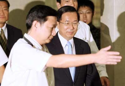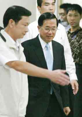 陳水扁今天上午9點20分驅車抵達臺北地院,一身筆挺西裝、藍色領帶、白色襯衫,臉上還露出略帶嚴肅的淺笑。沒有對媒體發表談話的他,似乎仍對今天的大對質充滿信心。