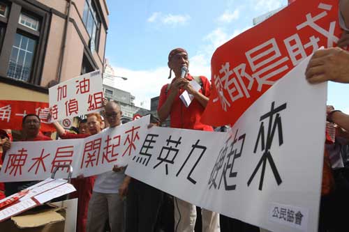 前紅衫軍干部林正杰(右)十日帶領一群紅衫軍成員在臺“雙十”大會現場外圍,高舉標語海報,要馬英九硬起來,同時呼吁特偵組盡快將陳水扁抓起來。(“中央社”圖)