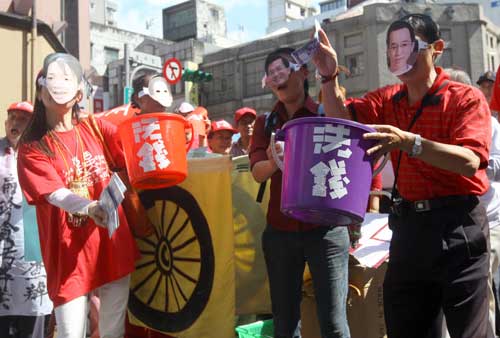 紅衫軍演出街頭行動劇諷刺陳水扁一家洗錢。(“中央社”圖)