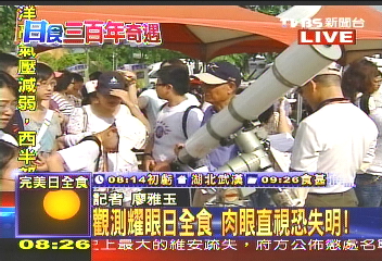一大早,臺(tái)灣島內(nèi)的電視臺(tái)就開(kāi)始通過(guò)直播報(bào)道,外派記者紛紛從成都、重慶、武漢、杭州等地發(fā)回報(bào)道,島內(nèi)觀眾通過(guò)第一時(shí)間如臨現(xiàn)場(chǎng)欣賞到日全食盛況。