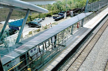 4月22日是世界地球日,臺南縣環(huán)保局及縣府工務(wù)處22日聯(lián)合在南科車站宣導(dǎo)綠能科技,臺南縣長蘇煥智說,臺鐵南科站六月底啟用,除太陽能發(fā)電具有綠色科技概念,因?yàn)檐囌就ㄜ嚕ㄇ谧蹇衫么蟊娺\(yùn)輸系統(tǒng)到南科園區(qū)各廠上班,先搭火車到南科站,再搭園區(qū)接駁車,更能有效節(jié)能減碳。