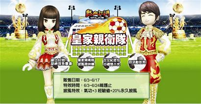 臺灣網游廠商也夠聰明,他們推出了應景的世界杯風格裝備產品。目前臺灣最熱血的武俠網游非華義旗下的“熱血江湖”莫屬。6月正值該游戲的改版升級階段,游戲服務商就順勢將6月打造成了“世足月”。其中最令球迷玩家興奮的就是,游戲地圖中將新增綠茵場為全新場景,游戲裝備也同步推出新款披風“皇家親衛隊”。這款披風除了可以幫助玩家增加經驗值、氣功攻擊力之外,還能讓玩家為自己喜愛的球隊加油打氣,在游戲中體驗拉拉隊的歡樂氛圍。(導報記者 燕子 綜述)