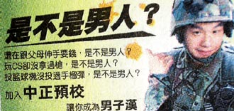 中新網4月8日電 據臺灣《聯合報》報道,只有男人才能念軍校?臺當局“國防部”中正預校今年的招生廣告,斗大的標題《是不是男人?》讓民代薛凌痛批軍方性別歧視,貶抑女性。