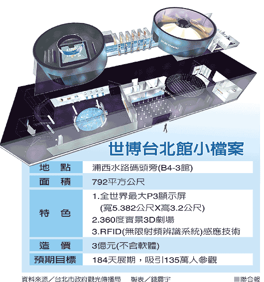世博會臺北館館長陳慶安表示,館內(nèi)一次開放84人參觀,全程參觀時間36分,以一天開放13個小時計算,約有2184人參觀。臺北館預計4月16日完工驗收,4月20日開放試營運。