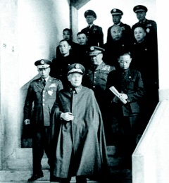 李立柏(第二排中、穿軍裝者)是蔣介石(前中)身邊的重臣。這是20世紀60年代他們步出臺當局“總統府”的檔案照片。(臺灣《聯合報》圖、李本唐提供)
