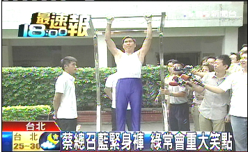 中新網6月18日電 據臺灣TVBS報道,民進黨“立委”蔡同榮日前穿上緊身褲,在鏡頭前表演拉單杠,17日他首度以綠營的黨團總召身份參加民進黨中常會,現場被猛吃豆腐。