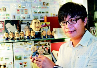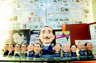 什么商品最受陸客歡迎?吳松洲指著玻璃柜里一排“政壇明星公仔”,包括抱黑貓白貓的鄧小平、手拿十大建設藍圖的小蔣,還有馬英九、蕭萬長等,笑說這是店里的“招財貓”,許多陸客一買就是二十幾個。