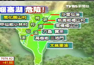 據臺灣TVBS報道,現在南部的關山村和東部的太麻里溪也拉警報,臺灣林務部門等全靠衛星圖片判斷堰塞湖的狀況,但卻無法了解水位的實況,這對災民來說是危機重重。
