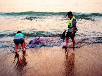 金山派出所昨天清晨5時接獲婦人報案,指出水尾沙灘有海豚擱淺。警員郭光明趕到現場察看,發現海豚困在沙灘,腹部擦傷滲血;郭與發現婦人想一起把海豚推回海里,但太重,而且海豚緊張地從噴氣孔噴氣,兩人擔心弄傷海豚,不敢再動。