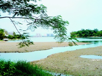 澄清湖因高屏溪原水濁度太高,且攔河堰抽水設備受損,已十天無法進水。水位從滿水位銳降至十六點五米呆水位,有效蓄水量僅剩四十多萬公噸,水庫處處可見裸露底泥的大片沙洲。