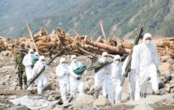 中新網(wǎng)8月20日電 臺(tái)軍部隊(duì)以及相關(guān)搜救人員連日來持續(xù)在高雄縣小林村等重災(zāi)區(qū)陸續(xù)搜索罹難者遺體,當(dāng)?shù)匕l(fā)現(xiàn)30幾處地面滲出血水,19日,搜救人員發(fā)現(xiàn)部分尸塊,推測(cè)是媽媽抱著小兒子逃命,卻不幸被傾流而下的巨大土石流掩滅。消息傳出,村人不勝唏噓。