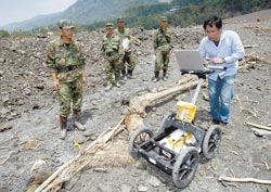 搜救人員表示,今天會(huì)再運(yùn)送兩臺(tái)儀器到小林村幫組搜尋,因?yàn)?zāi)難發(fā)生當(dāng)時(shí)很多人在屋內(nèi),故會(huì)先用儀器探測(cè)找出房舍再開挖。他們介紹儀器說,“電磁波探測(cè)儀”用來找尋地面下的石油、探礦,探測(cè)深度達(dá)十米;“透地雷達(dá)”則是發(fā)射雷射波,探測(cè)地面下是否有物體存在。