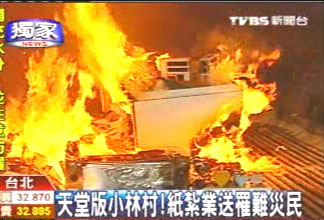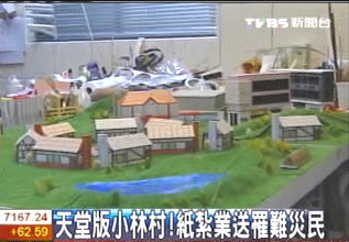 中新網(wǎng)9月4日電 臺灣“八八水災(zāi)”毀了高雄縣小林村,3日正逢中元節(jié),臺北縣有家專門制作“天堂配件”的紙扎公司,為讓死者安息,連夜趕工蓋出“天堂版小林村”,里頭除了住家、學(xué)校以及商店街,希望火化后,能讓不幸的罹難者,在天上有棲身之地。